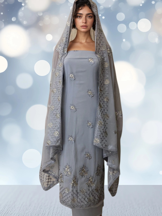 Gray color with Flower Bunch Embroidered Ind010