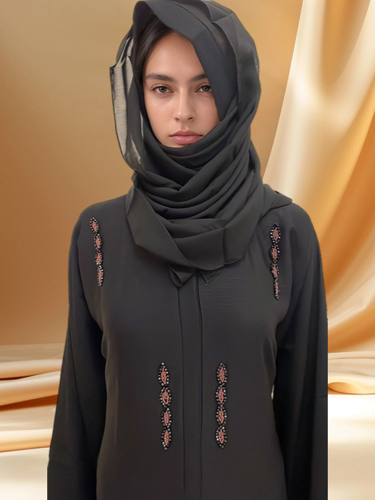 Handmade : Black Abaya Four Vertical leaf Emb.