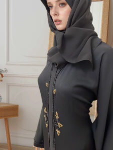 Handmade : Black Abaya Small Leaves on Line Emb.
