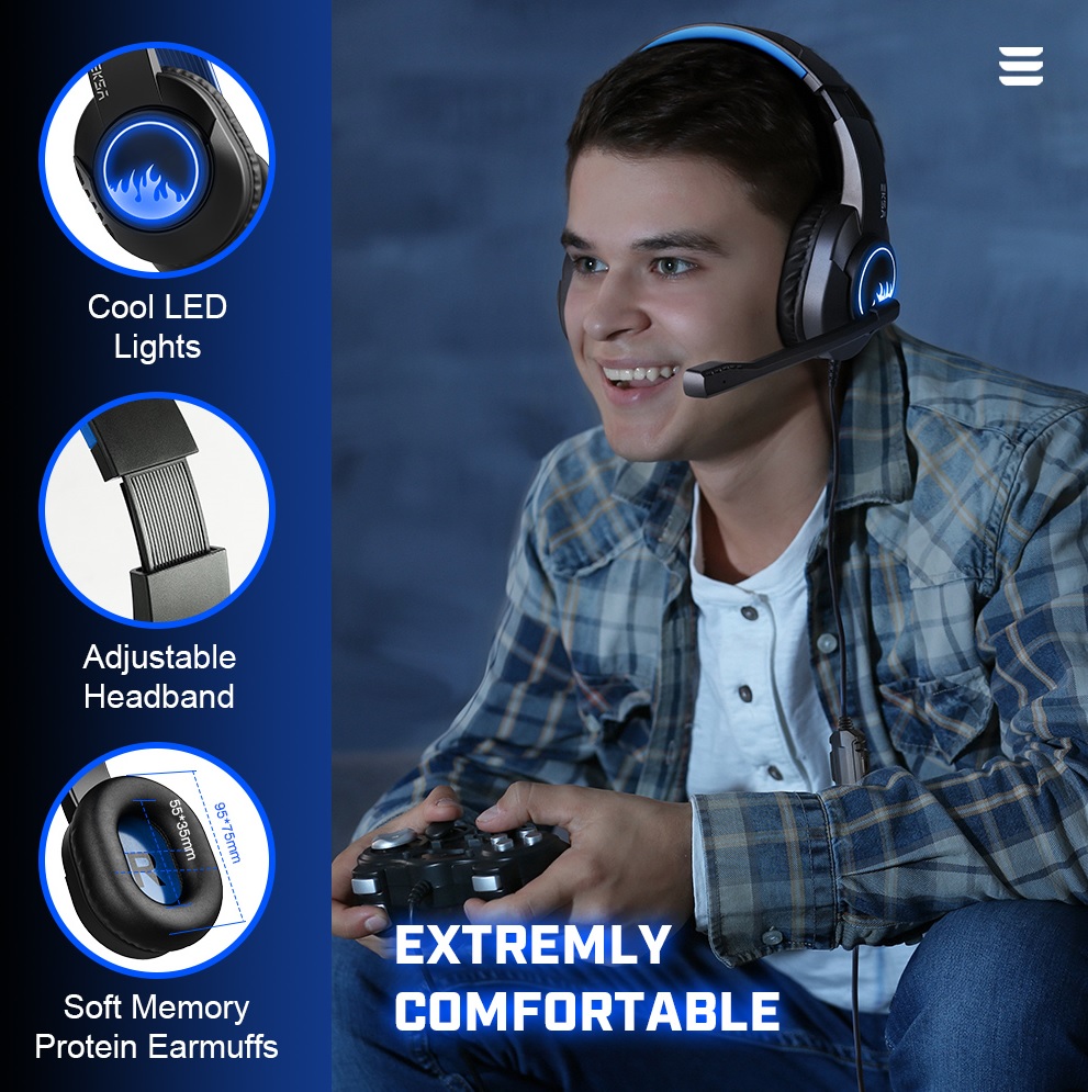 EKSA T8 Stereo, Noise Cancelling Over Ear Gaming Headphones – BLUE has 40mm driver which produces 3D Stereo Surround Sound effect offering noise cancelling microphone and multi-platform compatibility.