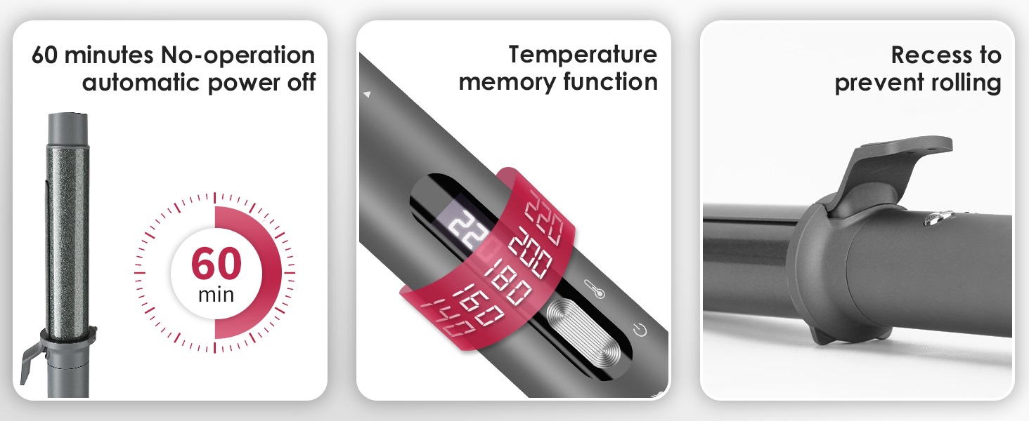 • 5-Level Temperature & Memory Function: The curling iron comes with an LCD digital display and a 5-level temperature setting function (140℃, 160℃, 180℃, 200℃, 220℃). You can choose the appropriate temperature according to different hair types, and achieve perfect curls, personalized just for you. And the hair curler will remember the temperature of your previous setting and automatically restores it when powered on, with no need to re-set it again. This design makes usage become more convenient