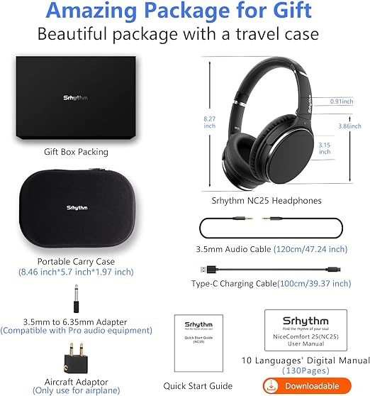 Srhythm Brand NC25 Headphones Bluetooth 5.3, Active Noise Cancelling, ANC Stereo Headset Over-Ear with Hi-Fi,Mic,50H Playtime, Voice Assistant, Low Latency Game Mode